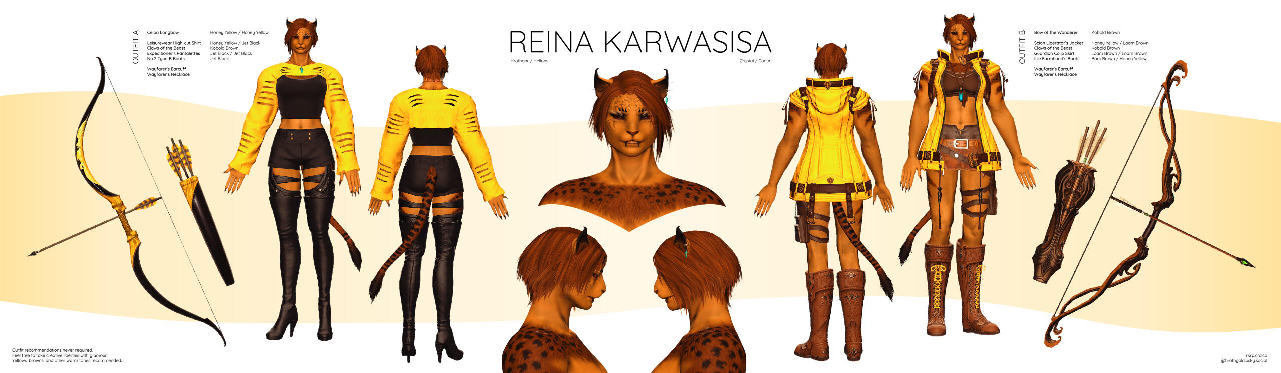 Born beneath the vibrant canopy of Yok Tural, in the tropical sprawl of Y'ak Tel near the warm village, Iq Br'aax, Reina came into the world laughing. Or that’s what her mother liked to say. She was an energetic spirit from her first breath. The daughter of a skilled hunter and a well-traveled culinarian, Reina was raised in a home where stories flowed as freely as the scent of vibrantly spiced meals from the hearth.From a young age, Reina was drawn to the wild, whether it was diving into cenotes, chasing birds through the underbrush, or helping her mother prepare fresh-caught fish with a dusting of herbs, every day felt like a small adventure. One of her most treasured tales began the day she found a griffin egg, half-buried in the sands beyond the cliffs. Against all odds, she nurtured the hatchling into a proud companion. Waman, as she simply and affectionately referred to her, became her shadow and her wings, loyal to the core and just as spirited as her rider.When she came of traveling age, the pull of the unknown grew stronger. She said her goodbyes, kissed her mother’s forehead, and, with Waman flying alongside, set sail across the salt eastward to Eorzea. There, in the deep green heart of the Black Shroud, she found a home of sorts with the Archers' Guild in Gridania. Already sharp with a bow, she quickly adapted to the refined techniques of the guild, adding finesse to her instinctive skill. Bounty hunting followed naturally. It paid reasonably and afforded her the luxury of pursuing her wanderlust.To those she meets, Reina can seem almost aloof, steadfast and deliberate, giving off a sense of reservation and stoicness. But anyone who entertains more than a moment in her company soon understand there’s a warmth that emanates from within that invites sunny pleasantries and beyond. Her words often dance with a teasing cadence, and her habit of playful banter has been known to cause the occasional flustered misunderstanding.Reina finds joy in simple pleasures: lying in a sun-drenched meadow, book in hand; plunging into the shock of a cold river; cooking over an open fire, experimenting with whatever local ingredients she’s scrounged or bartered for. Every town is a new page, every dish a new delight. Her wanderlust is her calling, driven not by a need to escape, but a hunger to experience.And yet, no matter how far she roams, her heart never strays far from the cliffs of Y'ak Tel or the comforting scent of her mother’s kitchen. It’s not common that she returns home, but it’s always the warmest of welcomes every chance she makes it back through her loving parents’ open door.